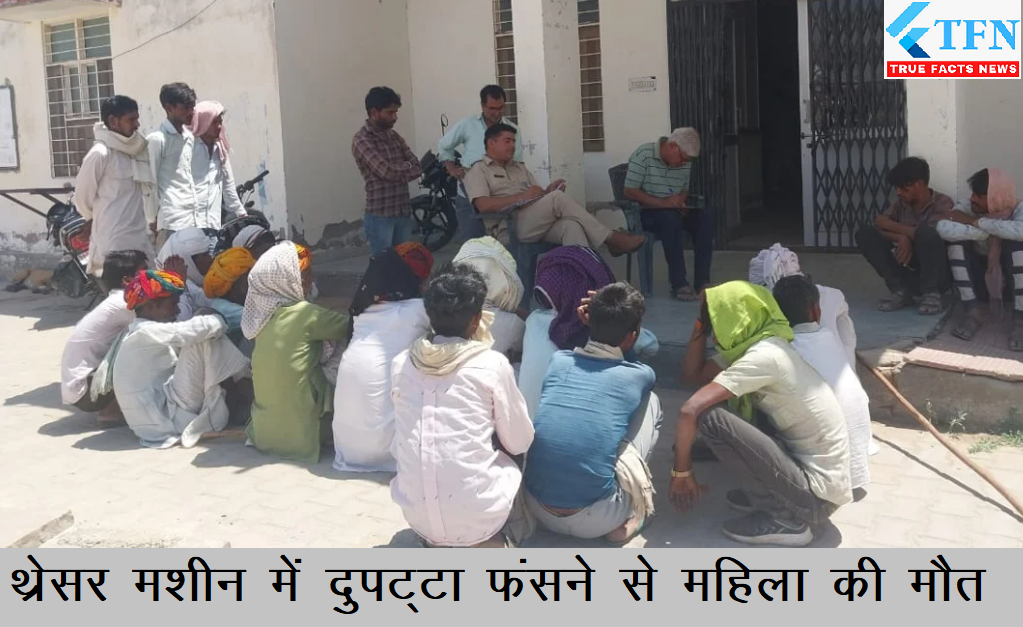 जयपुर में फागी उपखण्ड के आवण्डिया गांव में खेत में गेहूं निकालते समय महिला का दुपट्टा थ्रेसर में फंसने से मौत हो गई। हादसे से परिवार में कोहराम मच गया। महिला को अस्पताल ले जाने का भी मौका नहीं मिल सका और उसने मौके पर ही दम तोड़ दिया।