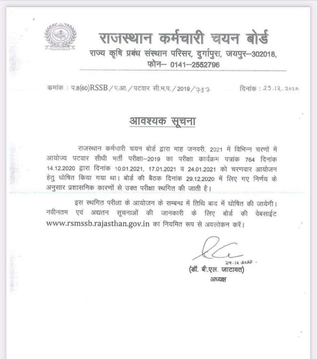 जयपुर – राजस्थान कर्मचारी चयन बोर्ड द्वारा जनवरी 2021 में पटवार भर्ती परीक्षा 2019 के संबंध में चरणबद्ध रूप से परीक्षा के आयोजन की घोषणा की गई थी | इस हेतु परीक्षाएं 10 जनवरी 2021, 17 जनवरी 2021 एवं 24 जनवरी 2021 को होनी थी | अभी हाल ही में 29 दिसंबर 2020 को बोर्ड की बैठक आयोजित की थी जिसमें प्रशासनिक कारणों से उक्त परीक्षा के स्थगन का निर्णय लिया गया | वर्तमान में उक्त स्थगित परीक्षा के आगामी आयोजन की तिथि घोषित नहीं की गई है | परीक्षा स्थगन की सूचना बोर्ड की वेबसाइट पर दे दी गई है | ऐसे में अब जल्द ही इसकी नई तिथि घोषित की जानी है |