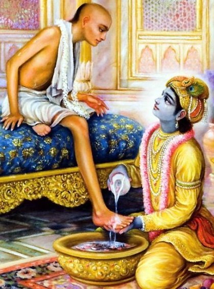 सुदामा नाम सुनते ही श्रीकृष्ण की खुशी का ठिकाना ना रहा और नंगे पांव दौड़ते हुए दरवाजे तक पहुंचे। उन्होंने सुदामा को अपने अंगपाश में समेट लिया- मित्र तुम आए तो लेकिन बहुत कष्ट भोगने के बाद आए। द्वारका में तुम्हारा स्वागत है। भगवान श्रीकृष्ण ने सुदामा को ले जाकर अपने पास बिठाया , उन्हे स्नान कराकर रेशमी वस्त्र पहनाए। रुक्मिणी स्वयं उन्हे पंखा झलने लगी। बहुत समय तक बचपन की बात करने के बाद श्री कृष्ण ने कहा- मित्र भाभी ने मेरे लिए क्या भेजा है। पहले तो सुदामा संकोच करते रहे, लेकिन अंत में श्रीकृष्ण ने चिउड़े निकाल ही लिए। भगवान ने उन तीन मुट्ठी चिउड़ो के बदले तीनों लोको की सम्पत्ति दे डाली।