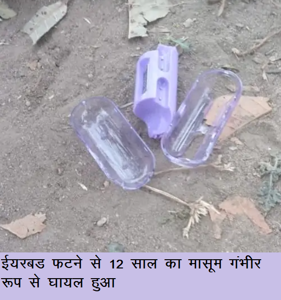 राजस्थान के भीलवाड़ा के बड़लियास थाना क्षेत्र के भकलिया गांव में 12 साल के बच्चे के हाथ में ईयरबड हुआ ब्लास्ट | भकलिया गांव में आइसक्रीम का ठेला लगाने वाले लादूराम का परिवार अपने बेटे राहुल (12) के साथ खेत पर गया था। ईयरबड में ब्लास्ट होने से मासूम गंभीर रूप से घायल हो गया। बच्चे की दो अंगुलियां फट गईं। वहीं आंख, सिर और पैर पर भी गहरे जख़्म आए हैं |