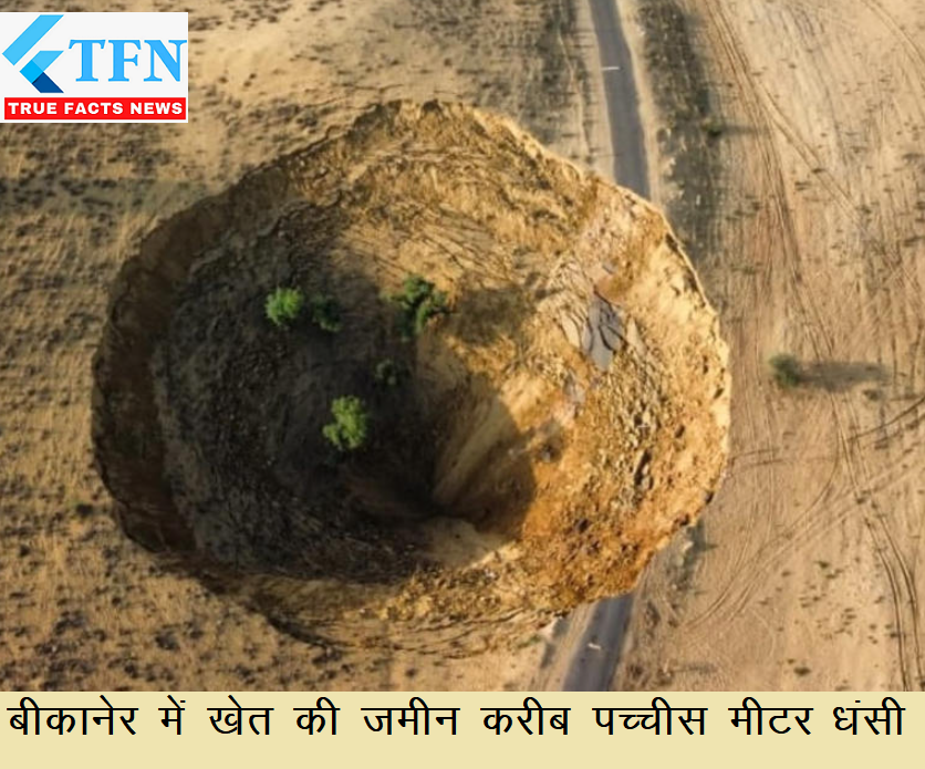 बीकानेर के लूणकरनसर में सहजरासर गांव की ढाणी भोपालराम में एक खेत में जमीन धंसी दिखाई दी | मौके पर पहुंचे भूगर्भ विभाग के अधिकारी का कहना है कि बहुत पहले कोई कुआं रहा है, जिसमें अब जमीन धंस गई है।