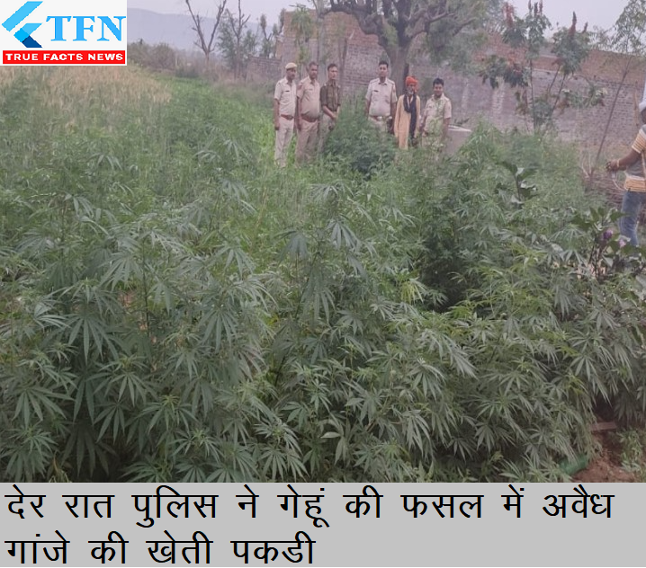 राजस्थान के दौसा जिले के पापड़दा में बालावास गांव में भक्तों की ढाणी में गेहूं की फसल की आड़ में उगा रखी गांजे की खेती को देर रात पुलिस ने दबिश देकर पकड़ी | पुलिस ने लगभग एक करोड़ के मूल्य के 2060 अवैध मादक पदार्थ गांजा के हरे व सूखे पौधे बरामद किये |
