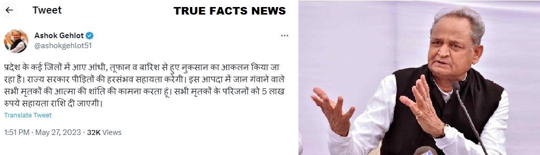 जयपुर, 27 मई 2023: राजस्थान के मुख्यमंत्री अशोक गहलोत ने आज तूफान के पश्चात घटित हुए नुकसान की भरपाई करने के लिए सरकार की ओर से एक ऐलान किया है। यह ऐलान दुर्भाग्यपूर्ण तूफान से प्रभावित इलाकों में हुए नुकसान के प्रतिशत भरपाई करने का माध्यम होगा।